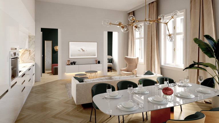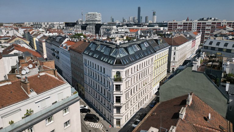 wurde mit Liebe zum Detail revitalisiert, saniert und um zwei Dachgeschoße ergänzt. Qualitativ hochwertige Materialien wie Weitzer Eichenparkett, hochwertige Eingangs- und Innentüren von Jansen Janisol und Kundex kommen zum Einsatz. Alle Wohnungen sind mit Kunststofffenstern ausgestattet. Die Dachgeschoßwohnungen verfügen über elektrisch bedienbare außenliegenden Raffstores. Fußbodenheizung, Wasser und Stromanschluss auf allen Freiflächen, Kinder und Fahrradabstellraum sowie moderne Gegensprechanlagen komplettieren die moderne Ausstattung.